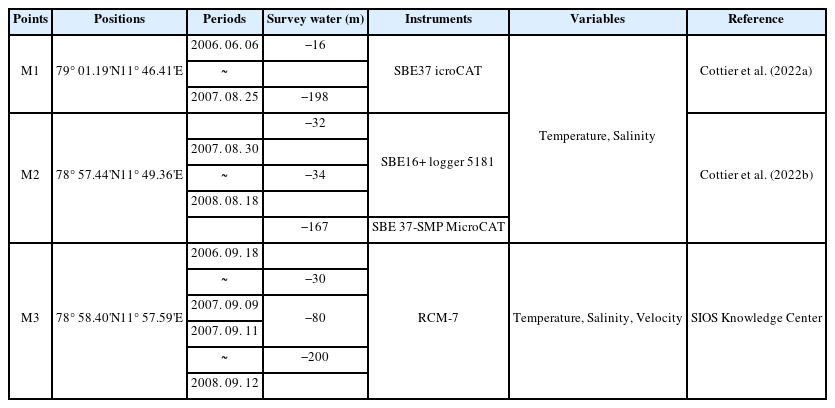 콩스피오르드와 크로스피오르드 지역에서 2007년 7월 19일부터 9월 16일까지의 기간 동안 271개 지점(red dots in Fig. 1(c))에서 관측된 염분 및 수온 프로파일 데이터(Skogseth et al., 2019, https://data.npolar.no/dataset/074a215c-d1df-47a9-bea7-e0fcc37273c6)를 사용하였다. 해당 프로파일 데이터는 1994년부터 2014년까지 스발바르 대학센터(Universitetssenteret på Svalbard AS, UNIS), 베르겐 대학(University of Bergen, UiB), 노르웨이 극지연구소(Norwegian Polar Institute, NPI), 폴란드 해양학 연구소(Institute of Oceanology Polish Academy of Sciences, IOPAS) 그리고 노르웨이 북극 대학(Arctic University of Norway, UiT)에서 수집되었다. M1 및 M2의 계류 데이터는 Cottier et al.(2022a and 2022b, https://archive.sigma2.no)를 사용하였으며, M3의 데이터는 SIOS Knowledge Center에서 수집하였다(yellow triangles in Fig. 1(c)). M3에서는 수심 -30 m, -80 m, -200 m에서 계류 관측된 해류 데이터 또한 활용하였다. 해당 자료는 2006년 9월 18일부터 2007년 9월 9일까지, 그리고 2007년 9월 11일부터 2008년 9월 12일까지 관측된 해류 시계열이며, 본 연구의 수치모형 검증 및 분석에 사용하였다. 수온, 염분, 해류 계류 관측 자료의 세부 수집 정보는 Table 1에 제시하였다.