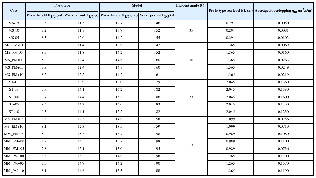 Table 1의 첫 열에 제시한 실험명칭에서 처음 영문 알파벳 2글자의 MS는 태풍 마이삭, MM는 태풍 매미, ST는 설계기준초과(stress test) 태풍을 의미하며, 중간 영문 알파벳 2글자의 PM은 가능최대 태풍(probable maximum typhoon)을, EM은 현상태 최대 태풍(existing maximum typhoon)을 의미한다. 마지막 숫자 2자리는 태풍에 의한 폭풍해일고 시계열의 최고 해수위 발생 시점을 기준으로 +00은 최고 해수위 발생시점, ±15는 최고 해수위 발생시점으로부터 1.5시간 후/전 시점을 의미한다. Table 1에서 마지막 열의 해수위는 10% 초과 고조위, 폭풍해일 수치모의에서 주어지는 최대 폭풍해일고, 지구온난화로 인한 해수위 상승고를 고리 지역평균 해수 위에 더한 최대 해수위로서 인천 지역평균 해수위로 환산한 표고(EL)이다. Table 1의 마지막 열의 qm은 남측구간의 7개 지점(#9-#15)에서 관측된 월파량을 평균한 값이다.