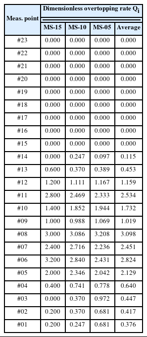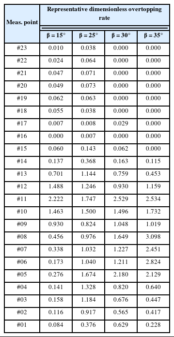 입사각 β = 35o에 대한 관측 월파량 qi를 남측구간 평균 월파량 qm으로 나누어 무차원화한 무차원 월파량 분포를 Table 2에 제시하였다. 여기서 맨 마지막 열의 평균 무차원 월파량은 각 입사각에 대한 대표 무차원 월파량이다.