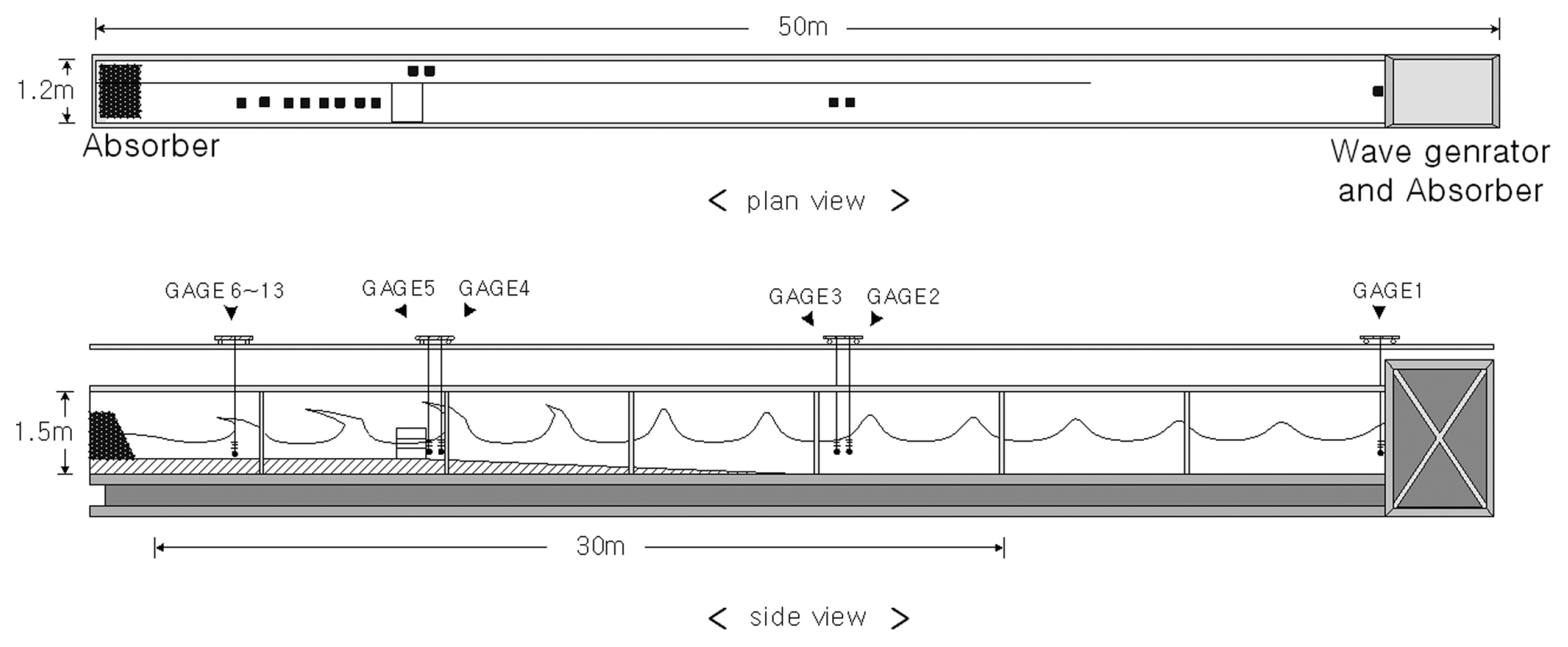 2차원 수리실험은 한국건설기술연구원의 폭 1.2m, 높이 1.5 m, 길이 50m의 단면수로에서 수행되었으며, 단면수로에는 전기서보 피스톤식 조파기가 설치되어 있고, 규칙파 및 불규칙파를 조파할 수 있다(Fig. 1 참조). 실험에 사용된 실험시설의 제원 및 성능은 Kim and Lee(2015)를 참고할 수 있다.