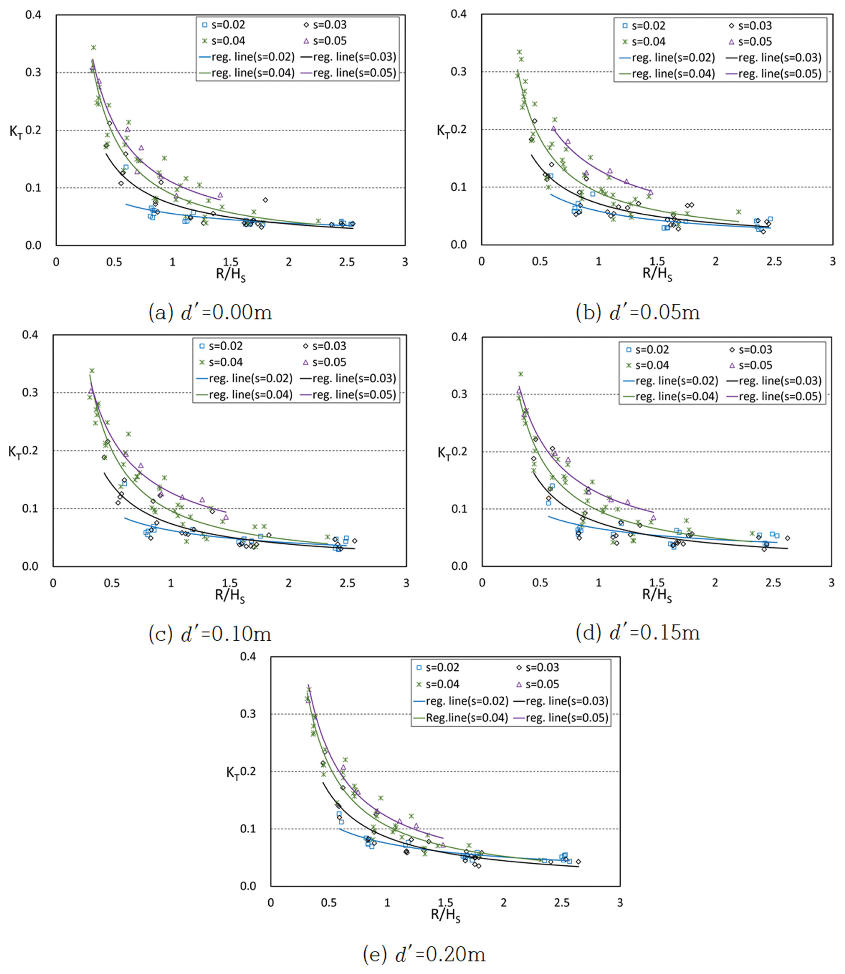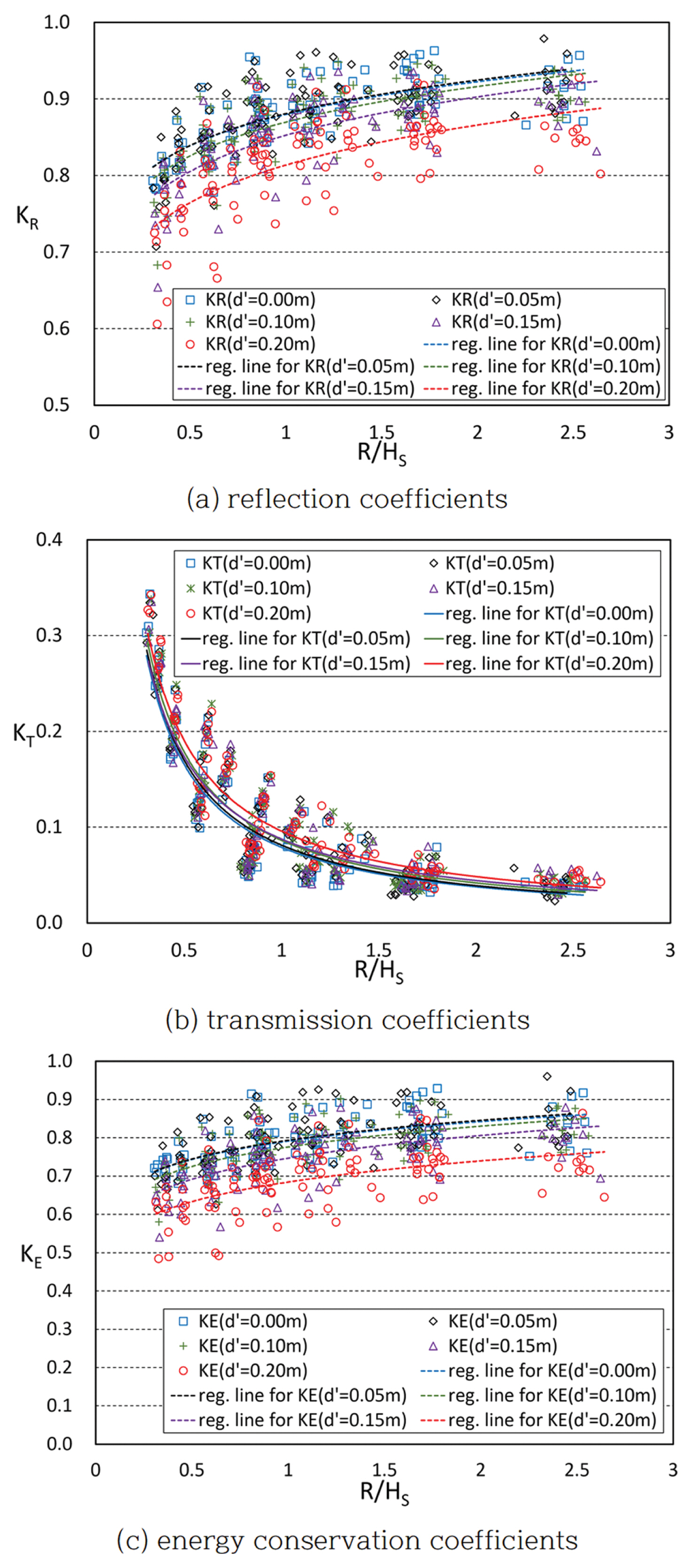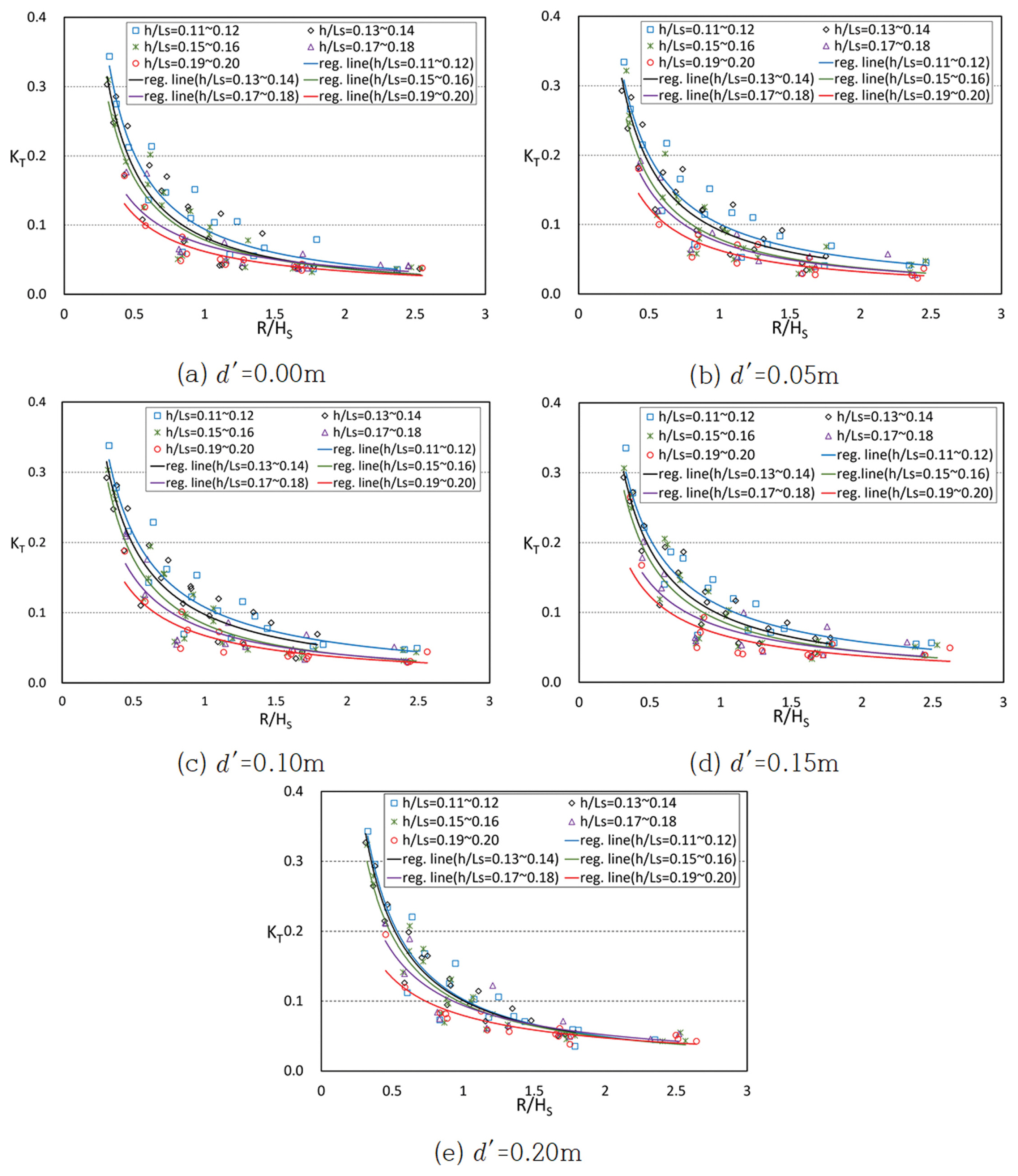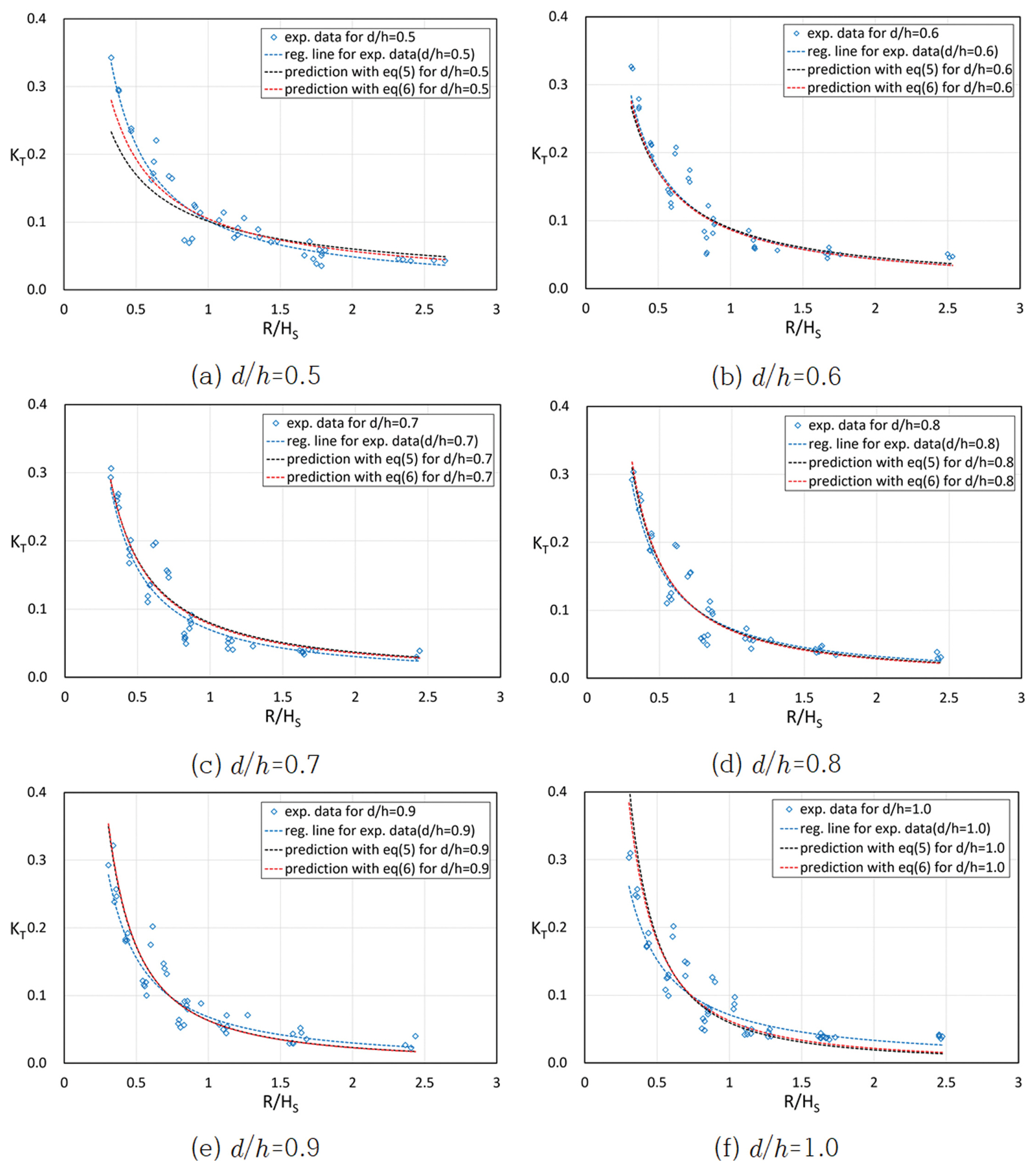 Goda(1969)는 규칙파를 적용한 실험결과를 이용하여 sine 함수를 포함하는 전달계수 산정식을 제시하였다. 본 연구에서는 Heijn(1997)의 제안식과 같이 지수함수를 포함하는 경험식을 제시하기 위해 실험결과를 이용한 회귀분석을 실시하였다. 4.1절에서 주기의 영향을 고려할 수 있는 무차원 변수인 HS/LS 또는 h/LS가 전달계수에 영향을 미치는 것을 확인하였다. 이에 Goda(1969) 및 Heijn(1997)의 제안식에 포함된 무차원 변수인 R/HS와 d/h 이외에 주기의 영향을 고려할 수 있는 무차원 변수인 HS/LS 또는 h/LS를 이용하여 비선형 회귀분석을 수행하였고, 각각의 결과는 식(5) 및 식(6)과 같다. 식(5)와 식(6)의 회귀분석시 적용된 무차원 변수들의 범위는 R/HS = 0.3~2.6, s(= HS/LS) = 0.02~0.05, d/h = 0.5~1.0, h/LS = 0.11~0.20이다.