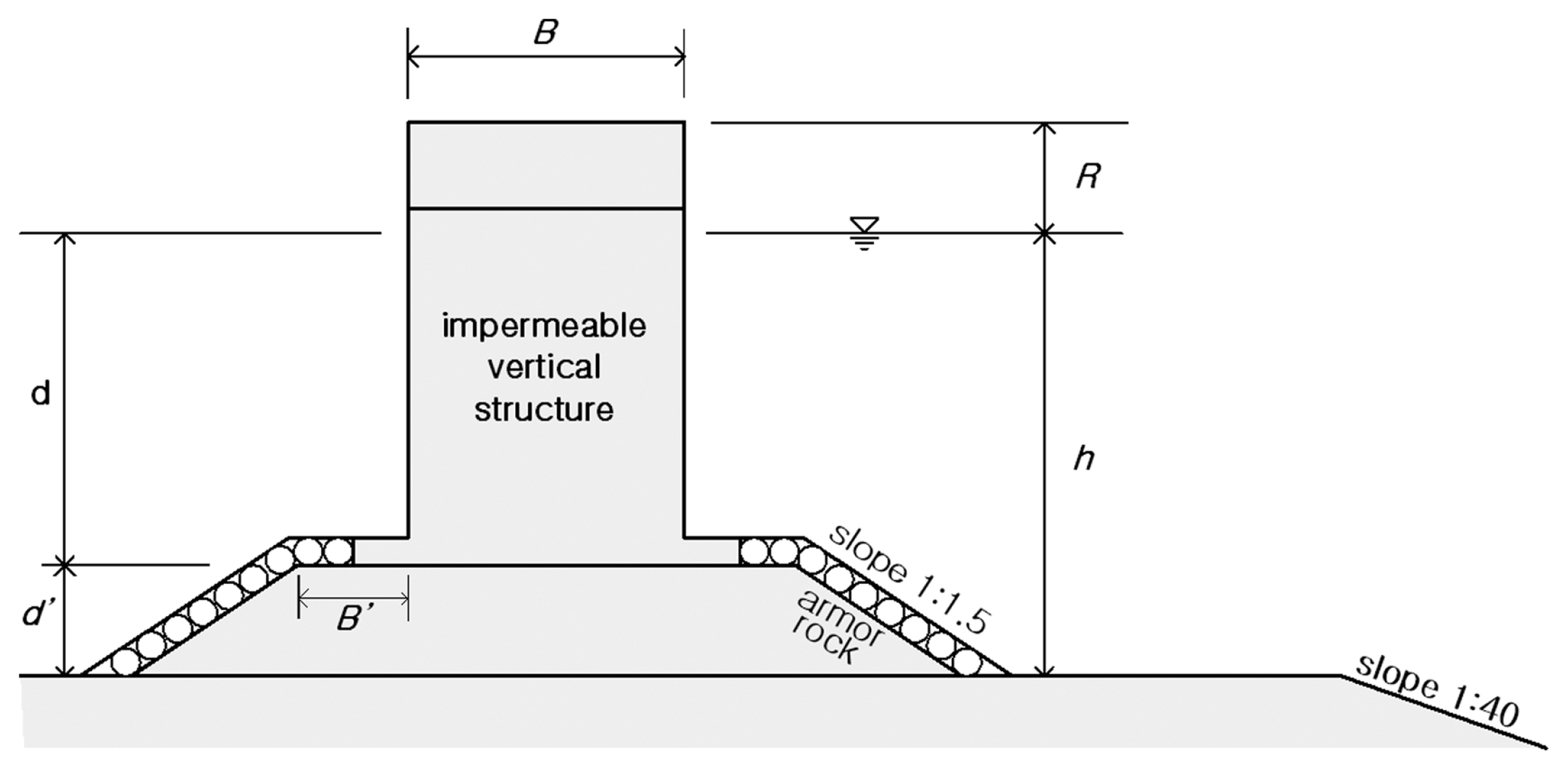 본 실험에 적용된 실험단면은 제체사석 위에 무공 직립제가 설치된 혼성제 단면으로서 실험단면의 형상은 Fig. 2와 같다. 구조물 설치수심(h)은 h = 0.4, 0.5 m이며, 여유고(R)는 R = 0.05, 0.10, 0.15, 0.20 m이고, 직립구조물의 폭(B)은 B = 0.4 m이다. 직립제가 설치되는 제체사석의 높이(d')는 d' = 0, 0.05, 0.10, 0.15, 0.20 m이고, 제체사석의 사면경사는 1:1.5이며, 20 g/ea의 피복석으로 경사면을 피복하였다. 따라서 제체사석 상단 수심(d)은 d = h - d'이다. 직립제 설치 기준선에서 제체사석 마루 끝단까지의 거리인 근고부 상단폭(B')은 B' = 0.08 m이다.