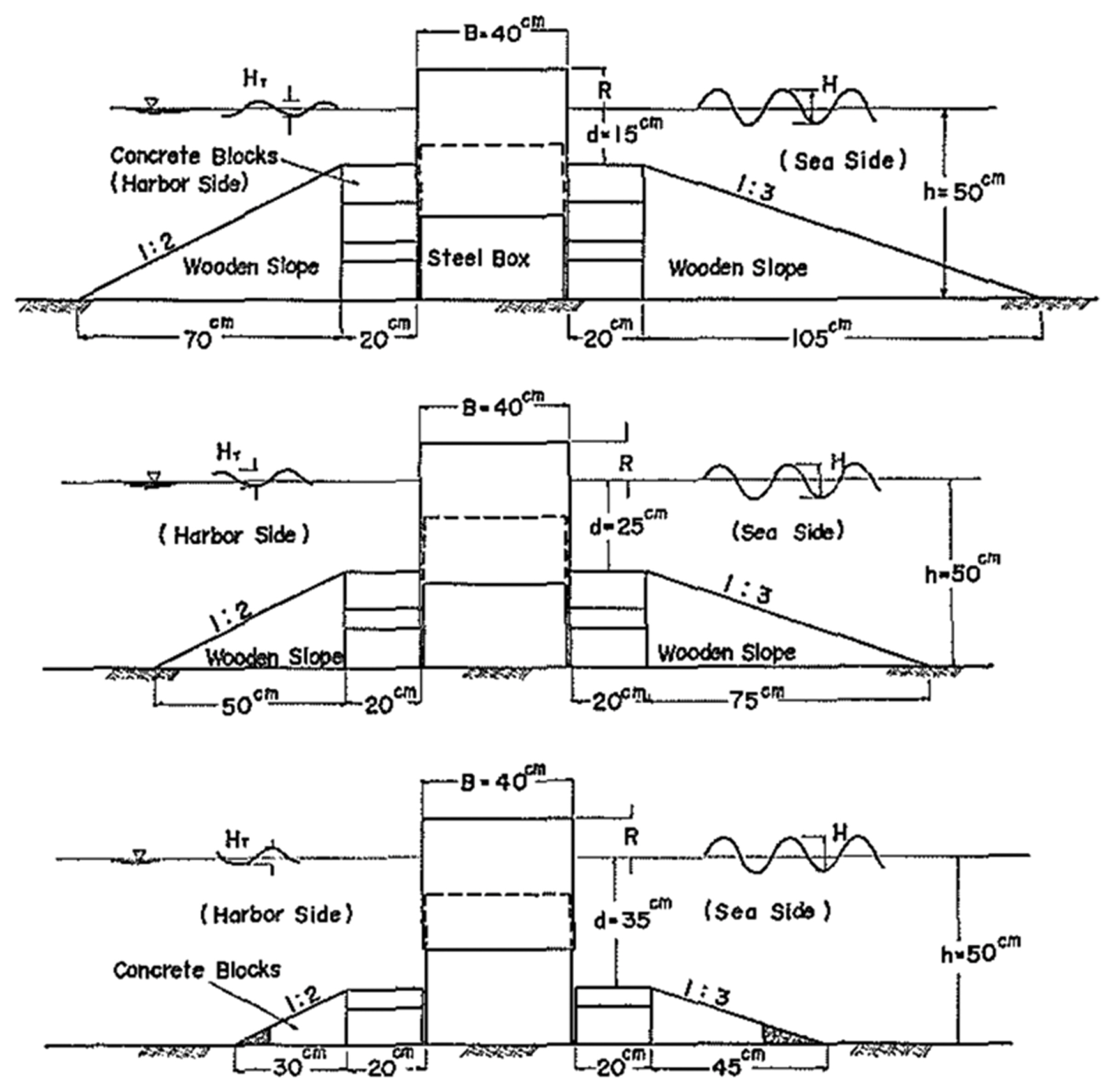 Goda(1969)는 Fig. 3과 같은 혼성방파제를 대상으로 규칙파를 적용하여 전달계수 산정식을 제시하였다. 구조물 설치 수심은 h = 0.5 m, 직립제 폭은 B = 0.4 m, 제체사석부의 높이는 d' = 0.15, 0.25, 0.35 m, 근고부 상단폭은 B' = 0.2 m이다. Goda(1969)는 직립제 하부의 기초사석부를 사면경사 1:3인 불투과성 경사면으로 구성하였다. 따라서 전달파고는 월파에 의해서만 발생하며, 제체사석부의 투과파에 의한 전달파는 Ito et al.(1966)의 성과를 활용하였다.