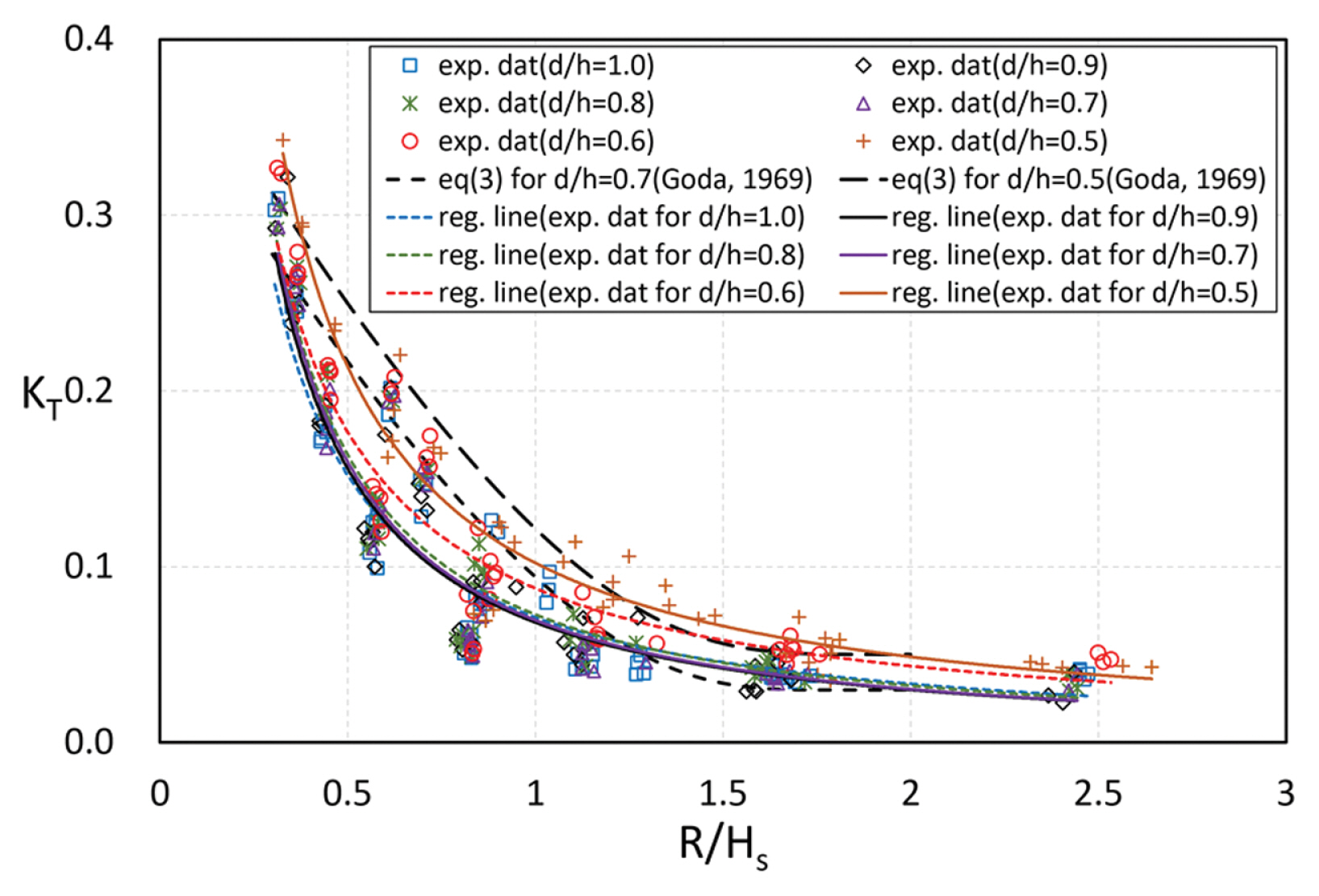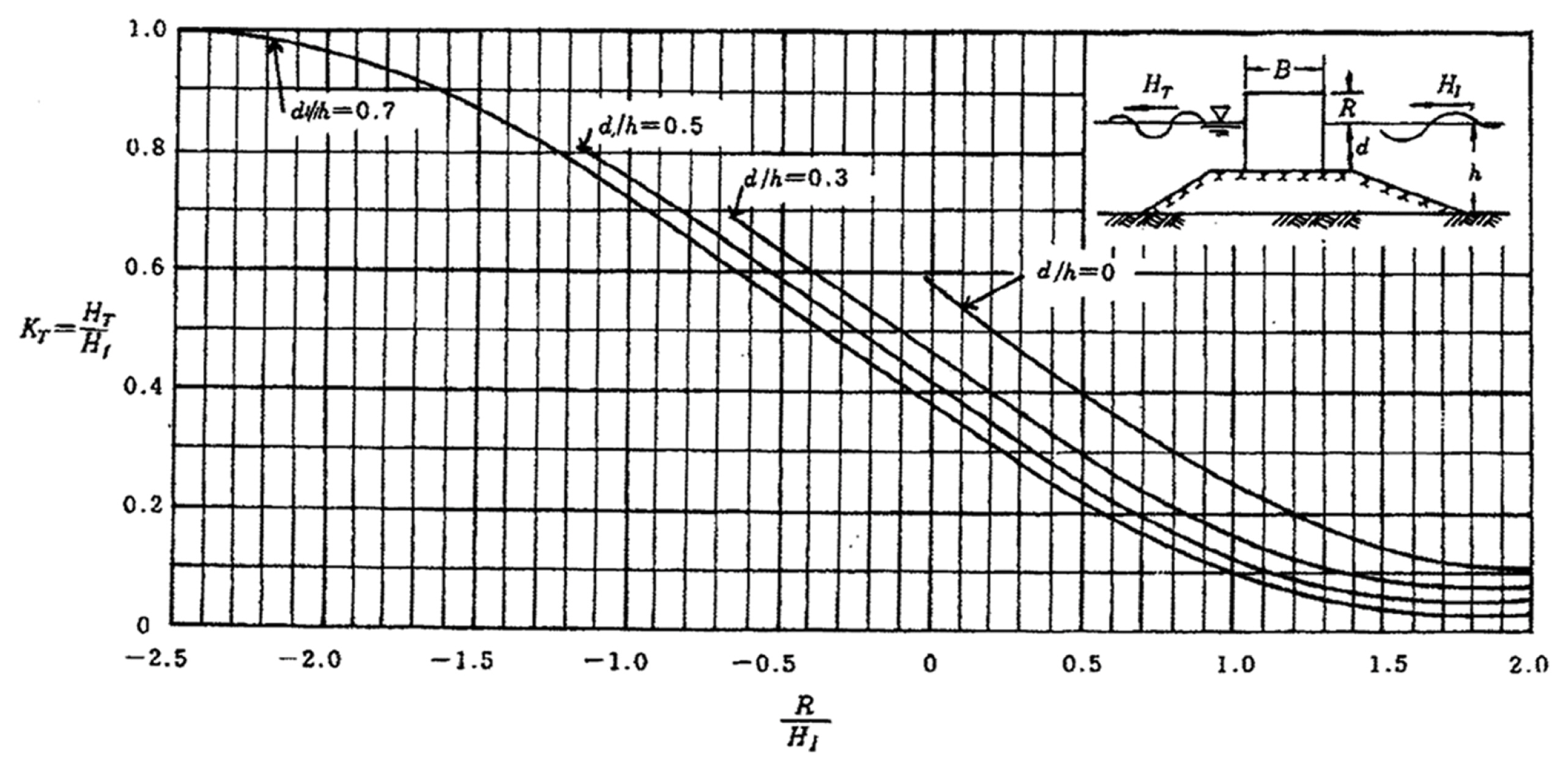 Takahashi(2002)는 일본의 방파제는 대부분 상대여유고가 R/HS = 0.6이며, 가장 일반적인 조건(typical condition)으로 d/h = 0.6을 적용하여 전달계수는 KT = 0.2라고 제시하였다.