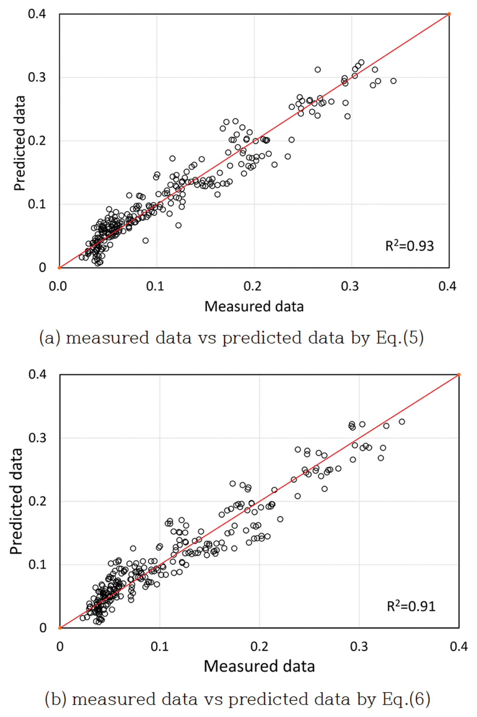 실험결과와 식(5) 및 식(6)의 상관계수는 각각 R2 = 0.93 및 R2 = 0.91로서 큰 차이를 보이지는 않는다. Fig. 9는 실험결과와 식(5) 및 식(6)으로 예측된 결과를 비교한 것으로서 전체적으로 실험결과와 비교적 잘 일치하는 것으로 나타났다.