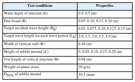 Table 1은 본 실험에서 적용한 실험조건을 정리한 것으로서 목표 유의파고(HS)와 유의파장(LS)는 구조물 설치 위치에서의 값이다.