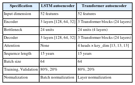 본 연구에서는 다수의 실행을 통해 4개의 레이어 층을 구성한 경우 과적합 문제를 해결할 수 없어 최종적으로 3개의 레이어 층으로 결정하였다. 본 연구에서 사용된 LSTM 오토인코더는 인코더와 디코더에 각각 3개의 레이어를 구성하였으며, Transformer 오토인코더도 공정한 비교를 위해 각각 3개의 블록으로 구성하였다. Transformer 오토인코더는 구조가 더 복잡하여, 블록은 여러 레이어의 묶음으로 이루어져 있으며 각각의 블록 내부에 4개의 head가 배치되도록 설계되었다. 모델의 head가 너무 많은 경우 과적합의 위험이 있으며, 부족한 경우는 feature를 충분히 분석할 수 없다. 본 연구에서는 52개의 feature를 사용하므로, 각 head에 13차원씩 할당되어 균형을 이루었다고 판단된다. 본 연구에서는 모델 학습을 위한 데이터가 비교적 풍부하여 training과 validation을 80%와 20%로 배분하였으며, 다수의 반복 연산을 통해 Table 2와 같이 결정된 하이퍼파라미터를 적용하여 최적의 결과를 도출하도록 하였다. Time-Lagged 오토인코더는 LSTM, Transformer 오토인코더의 구조에 입력 데이터 처리를 sliding window를 적용하는 부분만 다르다. 북서태평양 열대저기압의 장기 변화에 영향을 줄 수 있는 ENSO(El Niño-Southern Oscillation)와 PDO(Pacific Decadal Oscillation)를 고려하여 Sequence length를 15로 지정하여 연산을 수행하였다.