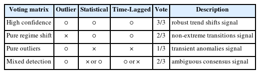 입력된 열대저기압 자료는 LSTM 및 Transformer의 autoencoder를 통해 outlier를 탐지하는 reconstruction error를 산출한다. 이후 앞서 설명한 3가지 탐색 기법을 거쳐 선별된 단기 및 장기간의 추세 전환 자료가 서로 다른 네 가지 종류의 voting으로 구성된 voting matrix로 만들어진다. Voting matrix의 세부 구성과 각각의 특성들에 대해 Table 3에 소개하였다. Voting matrix는 High confidence, Pure regime shifts, Pure outliers, Mixed detection 등 네 종류로 구성된다. Pure outliers는 일시적이고 극단적인 regime shift가 없는 outlier를 주로 검출하며, Pure regime shift는 좀 더 긴 기간에 대한 변화를 검출하는 데 특화되어 있어서 outlier 없는 구조적인 변화를 관찰하는 데 사용된다. Pure outliers는 2005년 미국에서 발생한 허리케인 카트리나와 같은 일회성 극한 사건을 보여주며, Pure regime shift는 반대로 극한 이벤트는 아니지만 장기 트렌드 변화의 시작점으로 보이는 지점이며 시스템의 근본적 변화를 의미한다. Mixed detection은 단기 이상인지, 구조적 변화인지 불분명하거나, 아니면 단기 이상인지 시간 패턴 변화인지 불분명할 때를 의미한다. 이것은 완전한 확신은 없지만, 모든 합의를 보여주는 High confidence 보다는 조금 낮은 신뢰도를 보여주기 때문에 포함되었다. Mixed detection의 결과는 불확실하지만 무시할 수 없는 신호이기 때문에 반드시 전문가의 해석이 필요하다. 마지막으로 검출된 추세 전환 결과가 모두 중복되어 탐지되는 High confidence를 최종 장기 추세 전환 지점으로 결정되도록 설계하였다. 이러한 과정을 통해 최종적으로 선택된 High confidence는 단기적 이상과 장기적 변화를 상호보완적인 방법으로 포착함으로써, 열대저기압의 장기 추세 전환에 대한 우수한 논리적 결과를 제공할 수 있다.