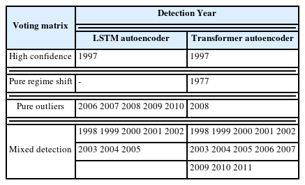 이러한 강한 변화 신호와 달리, 1980년 이전 기간에서 reconstruction error가 비교적 높음에도 불구하고 추세 전환 신호가 검출되지 않는 이유는, Voting matrix를 통해 여러 검출 알고리즘의 합의가 필요한데도 불구하고 과거의 결과는 단일 지표만 높았을 가능성이 높다. 더욱이 Transformer에 의해 1977년의 Pure regime shift 및 다수의 Mixed detection의 검출은 전 구간에 대해 미세한 변화도 검출하는 특성을 보여준다.
