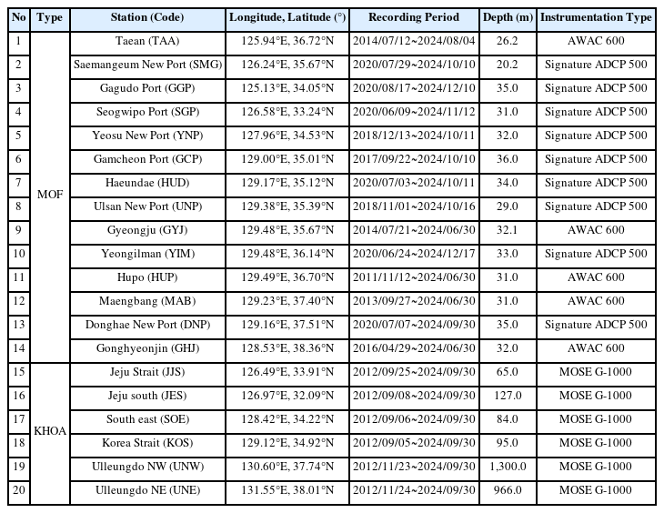 본 연구에서 선정한 분석 대상 지점은 관측 기간이 3년 이상인 지점으로 한정하였으며, 이는 유의파고의 통계적 신뢰도를 확보하기 위해 최소 3년 이상의 관측 기간이 필요하다는 선행 연구를 근거로 결정하였다(Cho et al., 2013). 한편, 분석에 사용된 해양수산부와 국립해양조사원의 유의파고 자료는 기관별로 산출 방식에 차이가 있으며, 해양수산부에서 관측된 유의파고의 경우, 스펙트럼 분석법을 이용하고 있으며, 국립해양조사원의 경우, 파열 분석법을 이용한다. 분석 대상 지점의 위치도 및 관측 정보는 다음 Fig. 1 및 Table 1과 같다.