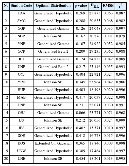 KS 검정을 통과한 후보 확률분포에 대하여, 추가적인 적합성 비교평가를 정량적으로 수행하기 위하여 Kullback-Leibler Divergence(KL-Divergence) 측도를 이용하였다. 이 방법은 경험적 확률분포와 후보 확률분포 간의 차이를 정량적으로 평가하는 지표로서, 다음 식(24)를 이용하여 각 확률분포의 기준 분포에 대한 차이를 정량화된 수치로 계산할 수 있다. 이 수치를 이용하여, 후보 분포함수의 적합 순위를 결정하였다(Belov and Armstrong, 2011; Wu et al., 2016).
