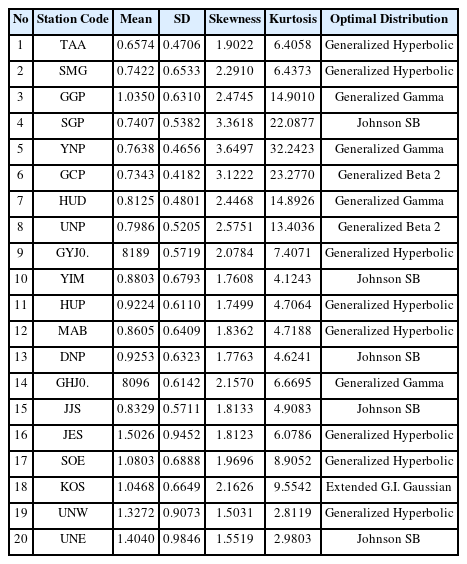 본 연구에서는 우리나라 연안 20개 지점을 대상으로 유의파고 관측자료에 적합한 확률분포함수를 평가하기 위하여 다양한 매개변수를 갖는 총 9개의 후보 확률분포함수를 적용하였다. 각 분포함수에 대한 매개변수는 최대우도추정법을 통해 산정하였으며, 모든 지점에서 산정된 모든 후보 분포함수 매개변수 값은 Appendix A에 제시하였다. 아울러, 최적 추정된 분포함수에 대한 KS 분포 적합 검정 결과(p-value)와 분포함수 사이의 적합 정도 비교를 위한 KL Divergence(DKL) 측도를 추정한 결과는 Appendix B에 제시하였다.