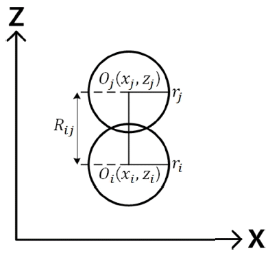 Fig. 1은 경계조건 아래 각각 요소 간 접촉판정 원리를 2차원 좌표계로서 나타낸 것으로 요소인Oi(xi, zi) 의 반경(ri)과 Oj(xj, zj) 의 반경(rj) 사이의 접촉판정은 식 (12)와 같으며, (rj + rj)은 인접하는 두 요소의 중심간 거리를 나타낸다. 그리고 임의의 요소인 Oi(xi, zi) 의 시각 t − Δt 로부터 t에 이르는 미소 시간증분 Δt 사이의 변위증분은 Δu, Δw 이다. 이러한 접촉판정은 접촉하고 있는 인접 입자 간에 작용하는 힘을 구하고 입자의 운동방정식을 푸는 것에 의하여 개별 입자의 운동을 해석하고 있으므로 다른 입자와 접촉하지 않는 한 다른 입자와의 사이에 접촉력은 작용하지 않는다.