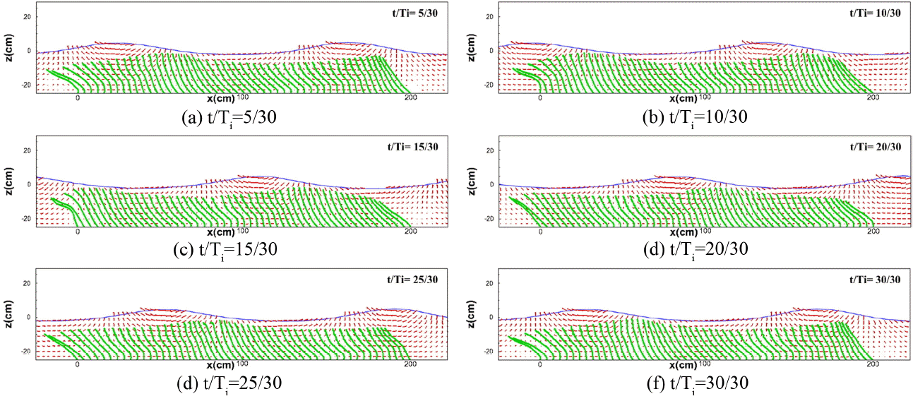 Fig. 3은 식생대의 높이(hv) 25 cm, 길이(Lv) 200 cm 및 분포간격(Dv) 4 cm의 경우에 파형경사(Hi/L) 0.056의 파랑 작용에 따른 연성식생의 운동특성을 나타낸 것으로 (a)는 t/Ti = 5/30, (b)는 t/Ti = 10/30, (c)는 t/Ti = 15/30, (d)는 t/Ti = 20/30, (e)는 t/Ti = 25/30, (f)는 t/Ti = 30/30의 계산결과를 나타낸다. 여기서 연두색선(