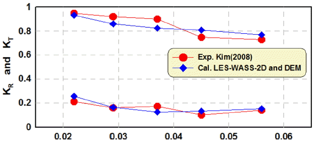 Fig. 4로부터 파형경사 중 특정영역(Hi/Li = 0.022, 0.045, 0.056)에서는 반사율(Kr)과 투과율(Kt) 모두 계산값이 실험 값과 높은 일치도로 나타나고 있으나, 특정 파형경사(Hi/Li = 0.029, 0.037)에서는 계산값이 실험값을 과대·과소평가 하고 있는 경향을 확인할 수 있다. 이와 같은 결과는 연성해석기법에 따른 수치파동수조에서 식생의 분포밀도, 상대길이에 의한 식생항력은 잘 재현하는데 반해 개별요소법에서 식생의 거동이 아직 고정도로 재현되지 않고 있기 때문으로 판단된다. 또한 식생대의 운동은 식생의 물성치(식생의 두께에 따른 운동특성)에 지배를 받게 되는데, Kim(2008)에서는이와 같은 식생의 정보를 찾아볼 수 없어 본 연구에서 임의의 값을 적용하여 연성식생을 재현하여 검토한 것도 하나의이유로 설명될 수 있다. 따라서 합리적인 식생의 물성치를 개별요소법(DEM)에 적용한다면 보다 우수한 결과를 도출할 수있을 것으로 생각되며 이에 대해서는 향후 더욱 많은 검토가필요할 것으로 판단된다.