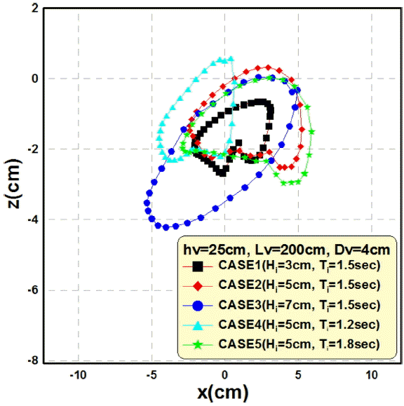 Fig. 6은 Fig. 5의 수치시뮬레이션 결과를 이용하여 식생대중앙부에 있는 식생 상단의 운동궤적 특성을 입사파고(Hi) 및입사주기(Ti)의 변화(CASE1 ~ CASE5)에 대하여 나타내고 있다. Fig. 6에서 검은색 네모(