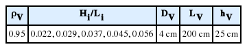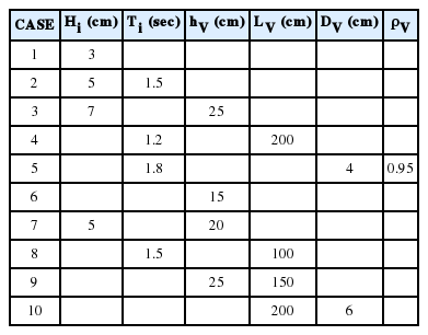 Fig. 2에 나타내고 있는 것과 같이 식생대의 파랑감쇠에 관한 검증을 실시한 수치파동수조를 이용하여 입사파고(Hi)와주기(Ti)변화, 식생대의 높이(hv), 분포(Lv), 분포간격(Dv)에 따른 파랑감쇠 특성을 파악하였다. 이용된 수치해석조건에 대한 상세한 사항은 Table 2에 나타내었다.
