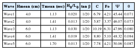 실험에 적용된 파랑은 Table 1에 나타나듯이 인공리프 미설치시 전후빈의 지형형변동에 영향을 미치는 침식성파랑에 대해 이론식을 이용하여 그 범위를 설정하였으며, 사전실험을 통해 침·퇴적 유무를 확인하였다. 그 중 표사이동에 뚜렷한 경향을 나타내는 제원(Hmean: 6 cm, Tmean:1.41sec)을 이용하여 실험을 진행하였다. 이때 파랑은 인공리프의 외측 어깨 법선에 파고계를 설치하여 실험파를 계측하였으며, 파랑이 내습할 때 비쇄파 조건으로 왜곡된 파형이 발생되지 않도록 하였다. 실험은 규칙, 불규칙에 대해 진행하였으며, 본 논문에는 규칙파에 대한 결과를 위주로 정리하였다.