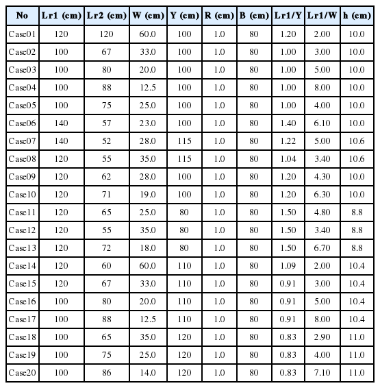 실험은 폭 300 cm, 높이 150 cm, 길이 250 cm의 수조에서 진행되었다. 하상은 베니어보드를 이용하여 해저경사 1/20의 기초마운드를 설치하였으며, 마운드 위에 0.01 cm(d50)의 표준사를 약 15 cm 도포하여 투수층 지반조건에서 파랑내습에 따른 흐름변화를 검토하고자 하였다. 인공리프는 보편적으로 사용되는 T.T.P 블록을 난적으로 설치하였으며, Fig.1에서 보여지듯이 마루수심을 1 cm로 고정시킨 후, 이안거리(Y, 83~100 cm), 개구폭(W, 12.5~60 cm), 리프길이(Lr, 100~140 cm), 블록의 외측 전면수심(h, 8.8~11 cm)을 변화하여 총 20개의 조건에 대해 실험을 진행하였다. 구조물의 배치와 파랑의 설정에 대한 치수결정에는 축척 1/50을 적용하였다. 다음 Fig. 2에 실험에 적용된 평면 배치안 중 대표적인 실험안