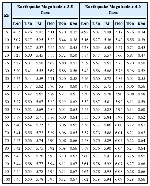 재현기간에 대한 설계 지진규모는 규모 3.5 이상, 4.0 이상 자료를 사용한 경우와 차이를 보이는 것으로 파악되었다 (Fig. 2 참조). 평균 추정규모는 지진규모 3.5 이상의 자료를 사용한 경우가 지진규모 4.0 이상의 자료를 사용한 경우보다 재현기간 50년을 기준으로 약 2%정도 작아, 미미한 차이를 보이는 것으로 파악되었다(Table 1 참조). 재현기간 10, 50, 100년의 경우 그 차이는 각각 0.11, 0.14, 0.16으로 규모 4.0이상의 자료를 사용한 경우의 추정 지진규모가 크게 나타났으며, 그 차이는 재현기간이 증가할수록 증가하는 경향을 보이는 것으로 파악되었다.