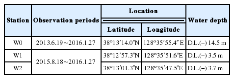 본 연구에서는 강원도 속초시 영랑동 해역에 내습하는 파랑 특성을 파악하고 잠제와 헤드랜드로 구성된 침식방지시설에 의한 파랑저감 효과를 분석하기 위해서 실해역 파랑 모니터링을 수행하였다(Table 1 및 Fig. 2 참조). 먼저, 속초 영랑동 해역에 입사하는 파랑 특성을 파악하기 위해서는 잠제 전면의 수심 D.L.(-) 14.5 m 위치(Table 1 및 Fig. 2의 정점 W0)에 초음파식 파향 · 파고계 AWAC(Nortek AS)을 설치하고 약 3년(2013년 6월 19일~2016년 1월 27일)에 걸쳐 파랑자료를 취득하였다. 그리고 잠제에 의한 파랑저감 효과를 분석하기 위해서 잠제의 남측(Table 1 및 Fig. 2의 정점 W1과 W2)과 북측 배후에 수압식 파고계를 약 6개월(2015년 8월 18일~2016년 1월 27일) 동안 설치하였다. 남측 잠제의 배후에서는 성공적으로 자료를 취득하였으나 북측 잠제의 배후에서는 기기 유실로 자료를 취득하지 못하였다.