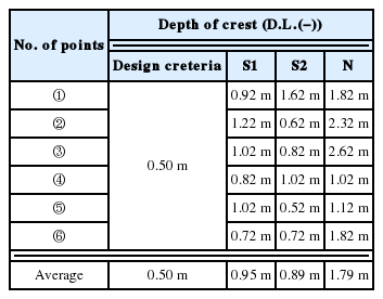 이와 같은 분석결과는 설계 시에 계획된 잠제 제원과 실해역에 설치된 잠제 제원의 차이에서 발생하였을 것으로 사료되며, 국내 · 외 인공리프 설계기준 및 설계사례 연구(DY Engineering, 2014)에서 조사한 자료에 의하면 영랑동 해안의 남측 잠제들은 설계 시에 계획된 잠제의 마루수심 D.L.(-)0.5 m에 비해서 약 0.4 m 정도 깊은 D.L.(-)0.9 m 정도로 설치되어 있는 것으로 조사되었다(Table 10. 참조). Table 10을 살펴보면 남측 1번 잠제에서는 마루수심이 0.72~1.22 m(평균치 0.95 m), 남측 2번 잠제에서는 마루수심이 0.52~1.62 m(평균치 0.89 m), 그리고 북측 잠제에서는 마루수심이 1.02~2.62 m(평균치 1.79 m)로 나타나서 설계에서 적용된 0.5 m에 비해 0.39~0.45 m 정도 깊게 유지되고 있는 것으로 나타났다. 이러한 마루수심의 차이가 설계 시의 파고전달률(Kt)에 비해 관측값이 상당히 크게 제시되는 점을 설명해주는 것으로 생각된다. 이렇게 시공된 잠제의 마루수심이 설계에 비해 상당히 커지는 점은 향후의 유사한 설계 및 시공에 참고 되어야 할 것이다. 단, 길이 100 m 또는 130 m, 폭 40 m의 잠제의 마루수심을 단지 6개 지점에서의 측정값으로 대표하는 것은 오차를 유발할 가능성이 존재함에 유의할 필요가 있다.