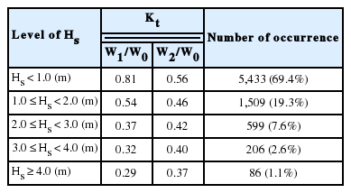 Table 4에는 정점 W0에서의 유의파고의 크기로 구분한 구간별로 정점 W1과 W2에서의 상대파고비들의 평균값을 정리하였으며, 이를 살펴보면 전반적으로 잠제에 의한 파고 저감효과는 입사파고의 크기에 비례하는 것으로 나타났다. 입사 유의파고가 2.0 m 이하일 때는 W1 지점보다 W2 지점에서의 파고 저감효과가 양호하게 나타났으나 유의파고가 2.0 m 이상인 경우에는 반대로 W1 지점보다 W2 지점에서의 파고 저감효과가 상당히 작게 제시되었다. 이러한 경향은 정점 W2에서의 수심이 3.7 m로 정점 W1에서의 수심 3.5 m에 비해 약간 더 깊었던 점도 영향을 미쳤을 것으로 사료되나 수치모형실험 등에 의한 추가 검토가 필요한 부분이다.