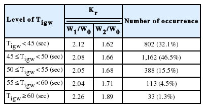 Table 5에는 정점 W0에서의 첨두주기의 크기로 구분한 구간별로 정점 W1과 W2에서의 상대파고비들의 평균값을 정리하였으며 후자가 전자에 비해서 대부분 작은 것으로 분석되었다. 즉, 정점 W2에서는 상대파고비들이 첨두주기의 크기에 상관없이 0.48~0.55의 상당히 일정한 범위로 제시된 반면, 정점 W1에서는 첨두주기가 8초 이하였을 때는 상대파고비가 0.75로 상당히 컸으나 주기가 길어짐에 따라 0.60에서 0.49까지 감소되는 경향을 나타냈다.