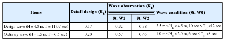 여기서, B는 잠제 마루폭(m), Lo는 심해파장, Ho는 환산심해파고, R은 수면에서 마루까지의 수심을 의미한다. Takayama 제안식에 의한 파고전달률(Kt)을 산정하기 위해서 마루수심은 실시설계 시에 계획된 0.5 m와 실해역에 설치된 잠제의 마루수심 조사결과 0.95 m(남측 1번 잠제), 0.89 m(남측 2번 잠제)를 적용하고 주기는 7초, 9초, 11초로 각각 구분하여 파고전달률(Kt)을 산정한 후 관측치와 함께 Fig. 6에 도시하였다(참조 Table 10, Fig. 9).