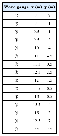 다공성 구조물과 파랑의 상호작용에 대한 적용성을 검토를 위해 Lara et al.(2012)에 의해 수행된 고립파(solitary wave)를 이용한 수리모형실험을 재현하였다. 다음 Fig. 5는 Lara et al.(2012)이 수행한 수리모형실험의 제원을 보여준다. 수조의 길이와 폭은 각각 17.8 m와 8.6 m이고 길이 4.0 m, 폭 0.5 m, 높이 0.6 m의 다공성 구조물은 수조로부터 x = 10.5 m만큼 떨어져있다. 다공성 구조물은 공극률 0.51이고 평균입경은 D50 = 0.015 m이다. 입사파의 조건은 수심 0.4 m, 파고 0.09 m의 고립파를 이용하였다. 또한 수조 전체에 15개의 위치에서 시간에 따른 수면변위를 관측하였으며 관측 위치는 다음 Table 1과 같다.