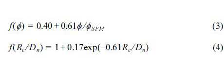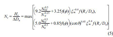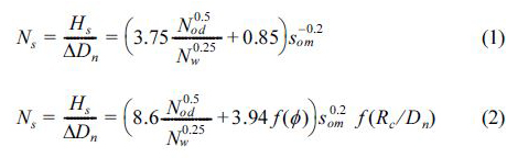 여기서 Ns는 안정수(stability number), Hs는 구조물 위치에서의 유의파고, Δ = ρs ⁄ ρw – 1(ρs와 ρw는 피복재와 물의 밀도), Dn= V 1/3(V는 피복재의 부피), Nod는 방파제에 나란한 방향으로 Dn의 폭에서 이탈되는 블록의 평균개수로 정의되는 상대피해, Nw는 폭풍 시 파의 개수, som(=Hs/Lom)은 파형경사, Lom(=gT2m /2π) 은 평균주기 Tm으로 표현되는 심해파장, 그리고 Rc는 마루높이다. 특히, 식 (2)에서 f (φ)와 f (Rc/Dn)는 각각 피복재 거치밀도(packing density)와 마루높이를 고려할 수 있는 함수이며 다음과 같이 표현된다(De Jong 1996; Van der Meer 2000).