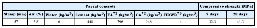 As shown in Fig. 4(a), the size of parent concrete specimens was 600 × 500 × 100 mm3, and 10 specimens were prepared. Table 2 shows the concrete mix proportions and measured strength values. Parent concrete compressive and splitting tensile strengths were measured, using ASTM C39 and ASTM C496, respectively. The water to cement ratio (w/c) adopted in this study was 0.37, and compressive and tensile strength values after 28 days were 41.3 MPa, and 3.0 MPa, respectively. The concrete surface to be coated was water-jetted after one day of concrete casting, as shown in Fig. 4(b). Concrete retarder was applied to the targeted surface, three hours after casting, to delay setting time. Concrete sample surface roughness was not systematically investigated in this study.