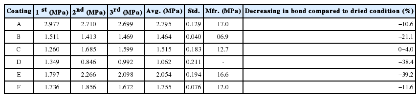 Generally, concrete failure means a good bond between applied coating and existing concrete, thus, this pattern can be more common in actual condition. In this study, however, adhesive failures underwater were only observed and this might be related to the time of measurement. Therefore, further experimental study is necessary to investigate the long-term performance.