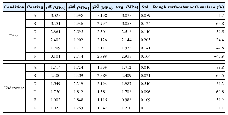 Underwater coating was carried out in the laboratory, and measured bond strengths were compared with those measured in dry conditions (see Table 4). Fig. 7 shows averaged bond strength values for smooth surfaces underwater. Measured water temperature ranged from 13.5°C to 18.5°C at the time of coating. Coating A had the highest bond strength, while those of Coatings D and E were both significantly reduced (38.4% and 39.2%, respectively). The reason for such differences was not clear, given the limited range of this research, but might be related to a dissolution issue that could have occurred underwater.