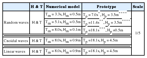 수치모의는 과도한 계산량을 피하기 위해 1/5 scale로 축소된 시공간에서 수행하였으며, Fig. 6에 도시된 계산영역은 445 × 297 × 20 = 2,643,330개의 절점을 사용하여 이산화 하였으며 북측 개방경계에서 2절에서 다룬 bound mode의 불규칙 파랑 조파 기법을 활용하여 조파하였다. 또한 비교를 위해 bound mode의 비선형 Cnoidal wave, linear wave를 대상으로 한 수치모의도 병행하여 수행하였으며, Table 1에는 수치모의에 사용된 파랑조건을 정리하였다.