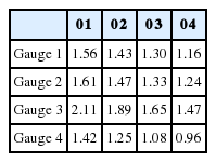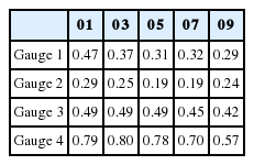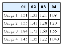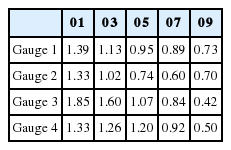 Fig. 8에는 삼척 LNG 생산기지 전용부두 전면수역에 설치된 Gauge 101~Gauge 409에서 관측된 자유수면 변위 시계열 자료를 도시하였다. Fig. 9에는 Gauge 101~109에서 75초~85초 사이, Gauge 201~209에서 77초~87초 사이, Gauge 301~309에서 80초~90초 사이, Gauge 401~ 409에서 83초~93초 사이에 관측된 각 Gauge별 파고를 Ho, rms로 정규화 하여 도시하였으며, Table 2에는 Gauge 101~Gauge 409에서 관측된 증폭비를 정리하여 수록하였다.