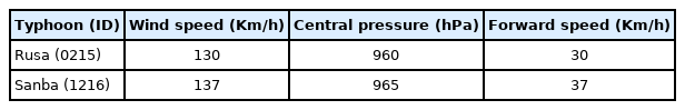 수치해석의 검증을 위해 남쪽에서 북쪽으로 최대한 직선에 가까운 이동 경로를 보여준 2개의 태풍을 선택하여 수치모델을 검증하였다. 태풍 Rusa(0215)는 2002년 8월 말 고흥에, 태풍 Sanba(1216)는 2012년 9월 중순에 통영에 상륙하였으며 그 특성은 Table 1과 같다. 직선으로 이동하는 두 태풍 모두 남해안에 상륙시 매우 강한 태풍이었으며, 한반도를 통과하는 태풍의 평균 이동속도가 30 km/h인 것을 고려하여 이에 근접한 태풍을 선정하였다. 본 연구에서 사용된 ADCIRC 모델을 검증하기 위해 상륙 지점에 가까우며 관측 자료 획득이 가능한 여수, 거제도에서 두 태풍 Rusa, Sanba의 폭풍해일과 실제 관측 자료와의 비교를 수행하였다(Fig. 2).