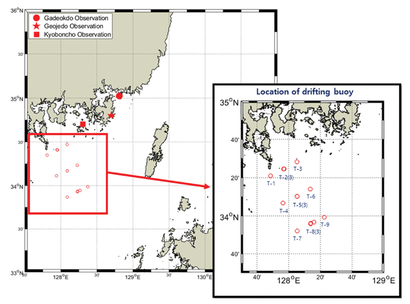 본 연구에서는 라그랑지 관측 방법인 표층 뜰개와 부이 추적 시스템을 이용하여 연안측에서의 해류장을 파악하고 단기 및 중·장기 관측을 통한 대한해협 및 동해의 전체적인 해류 공간 분포를 살펴보고자 하였다. 단기 관측으로 2020년 7월 21일부터 28일까지 총 9개 정점(T-1~T-9)에 15개의 표층 뜰개를 Fig. 1과 같이 투하하여 30분 간격으로 자료를 수집하였다. 특히 이 중 정점 T-2, T-5, T-8은 정점 내 약 200 m 간격으로 3개씩 연속 투하하였다. 표층 뜰개의 제원 및 투하 정점의 위치 자료, 현장실험 조건 및 전체 표층 뜰개의 이동 경로에 대한 보다 상세한 내용은 Ha(2021)의 문헌에 상세히 제시되어 있음을 밝힌다.