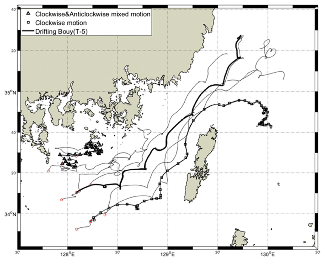 첫째, 대한해협에서 실시한 표층 뜰개 이동경로 실험에서 연안 해역과 인접한 정점에 투하한 표층 뜰개는 시계 또는 반시계 방향의 회전 운동이 혼합되어 나타났으며, 일부는 연안에 갇혀있는 모습을 보였다. 이에 반해 연안과 가장 먼 외측에 투하된 정점에 투하한 표층 뜰개는 시계방향 운동을 하며 북동향으로 이동하였다. 이는 지형류 및 계절풍의 영향에 의해서 연안에 인접한 표층 수괴는 상대적으로 외해측 수괴와 다른 흐름 패턴을 가진다고 생각할 수 있다. 또한 수심이 낮은 해안 쪽에서는 해저 마찰의 영향으로 해류 성분보다는 천해 조류의 영향이 더 크게 작용하기 때문에 일어나는 현상이 라고 판단된다.