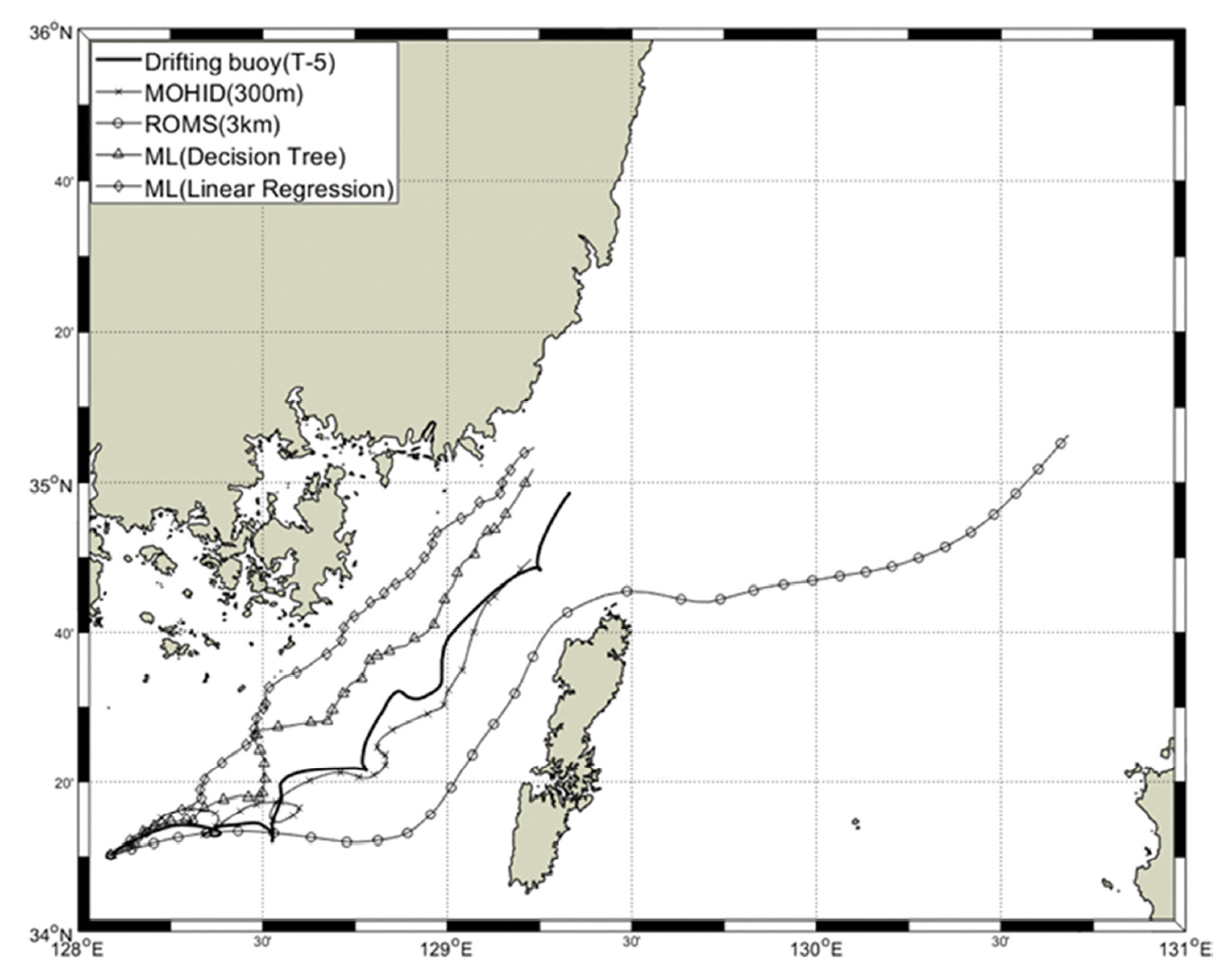 In order to improve the accuracy of particle tracking prediction techniques near the Korean Strait, this study compared and analyzed a particle tracking model based on a seawater flow numerical model and a machine learning based on a particle tracking model using field observation data. The data used in the study were the surface drifter buoy movement trajectory data observed in the Korea Strait, prediction data by machine learning (linear regression, decision tree) using the tide and wind data from three observation stations (Gageo Island, Geoje Island, Gyoboncho), and prediciton data by numerical models (ROMS, MOHID). The above three data were compared through three error evaluation methods (Correlation Coefficient (CC), Root Mean Square Errors (RMSE), and Normalized Cumulative Lagrangian Separation (NCLS)). As a final result, the decision tree model had the best prediction accuracy in CC and RMSE, and the MOHID model had the best prediction results in NCLS.