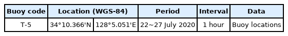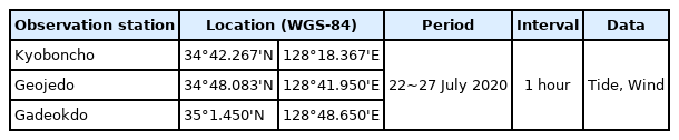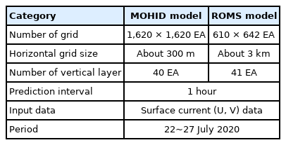 본 연구에 사용한 해수유동 수치모델은 MOHID 기반 300 m 격자 수치모델(이하 MOHID)과 ROMS 기반 3 km 격자 수치모델(이하 ROMS)이다. 본 모델은 현재 국립해양조사원에서 운용 중으로 매일 72시간의 해수면 높이/수온·염분/해수유 동을 예측하는데 사용된다. 대한해협에서 수행한 표층 뜰개 관측 자료와 수치모델 결과를 비교하기 위해 2020년 7월 22일부터 27일까지 표층 해수유동(동방성분(U) 및 북방성분(V) 성분) 자료를 추출하여 사용하였다(Table 5).