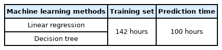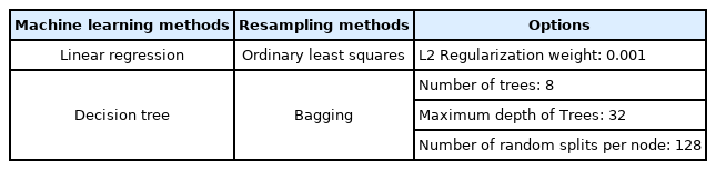 기계학습을 위해 Microsoftⓒ의 Azure Machine Learning으로 불리는 Non-code tool에서 선형회귀와 의사결정나무 기법의 하이퍼파라미터를 설정(Table 3) 후 142시간 자료를 학습시킨 후 100시간 후의 이동경로를 예측하였다(Table 4).