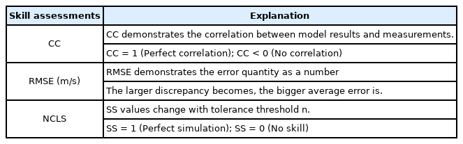 여기서, di는 관측지점과 모델의 거리차를 나타내며 loi는 관측치 이동거리의 누적합, N은 자료의 수, n은 임계치를 나타낸다. NLCS에 사용되는 임계치 n은 모델을 평가하는 영역과 수준에 따라 임의로 조절할 수 있으며, SS 값이 1에 가까울수록 모의를 완벽하게 한 것으로 판단 할 수 있다(Table 6). 본 연구에서는 참고문헌(Lee et al., 2017)에서 제시한 n = 1을 선택하여 적용하였다.