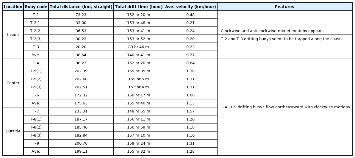 결과적으로 Fig. 2에서 알 수 있듯이 전남 여수시 연도 전면 해역과 인접한 정점 T-1~T-3에 투하한 표층 뜰개는 시계 또는 반시계 방향의 회전 운동이 혼합되어 나타났으며, 일부는 연안에 갇혀있는 모습을 보였다. 이에 반해 정점 T-4~T-9에 투하한 표층 뜰개는 시계방향 운동을 하며 북동향으로 이동하였다. 또한 투하된 표층 뜰개 중에서 총 직선 이동거리가 가장 작은 것은 정점 T-3으로 약 20.20 km이었으며 가장 멀리 이동한 것은 정점 T-7로 약 233.31 km이었다(Table 7). 그리고 투하된 표층 뜰개의 평균 직선 이동 거리를 산정해 보면 연안과 인접한 내측에 투하된 정점 T-1~T-3의 표층 뜰개의 경우 약 38.64 km, 중앙부에 해당하는 정점 T-4~T-6의 표층 뜰개의 경우 약 175.63 km, 연안과 가장 먼 외측에 투하된 정점 T-7~T-9의 표층 뜰개의 경우 약 199.11 km를 이동하였다.