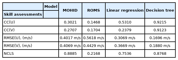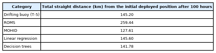 본 연구는 표층뜰개 관측 결과와 해수유동 예측 수치모델 기반 표류예측모델 2종(MOHID, ROMS), 기계학습 기반 표류예측모델 2종(선형 회귀, 의사결정나무)에 대해서 예측 정확도를 평가하기 위해 상술한 3가지 오차평가방법을 적용하고 그 결과를 Table 8에 제시하였다.