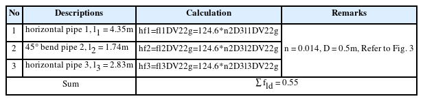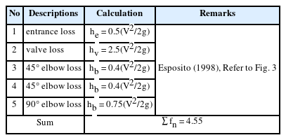 여기서, hm은 미소 수두손실(형상손실), fn은 손실계수이며, 흐름의 Reynolds 수와 경계면의 형상 등에 의해서 정해지는 실험계수이다. 본 연구에서는 유입 손실 수두(entrance loss) he, 밸브에 의한 손실 수두 hv 그리고 만곡부에 의한 손실 수두 hb 등을 고려하였다.