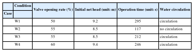 실험은 고수조에 물을 채운후 밸브를 개방하여 저수조로 물을 보내면서 실험을 수행하되, 고수조는 초기 수위를 변화시키고, 저수조는 초기 수위를 웨어(weir)의 정점에 고정시키고 실험을 수행하였다. 이때 유량 조절을 위하여 밸브의 개방율을 50%, 55%, 60% 총 3가지 경우로 제한하였다. 또한 발전 유량 확보를 위하여 펌프를 이용하여 저수조의 유량을 고수조로 회류시키면서 추가 실험을 진행하여 시간 변화에 따른 고수조 및 저수조의 수위, 웨어 월류 수심 등을 측정하였다. 실험 c ase는 Table 3에 정리한 바와 같이 총 4종류에 대하여 수행하였다.