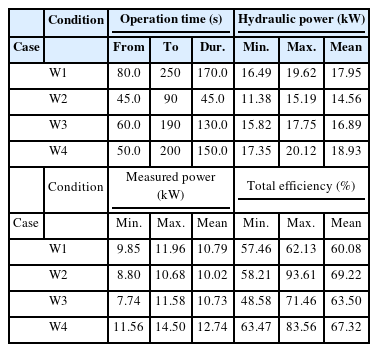 발전기의 운동특성은 정격출력(Rated output)에 도달하기까지 Ramp up 구간, 정격 출력되는 정상상태(유효전력) 구간, 그리고 발전 정지에 의한 Ramp down 구간으로 나누어져 있다. 이러한 경향은 4종류의 실험결과를 도시한 Fig. 5~Fig. 8에 잘 나타나 있으며, Ramp up/down 구간 전력은 무효전력 구간이므로 분석에서 제외하고, 정상상태 구간의 값을 통계 분석하여 Table 4에 정리하였다.