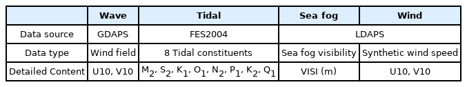 동적 위험도 평가에 사용되는 동적요소는 파랑, 조석, 해무, 풍속으로 구성된다. 파랑 산출을 위해 광역에서 바람장을 모의하였으며, 기상청의 GDAPS 수치예보모델을 이용하였다. 조석은 광역 개방경계조건에서 FES2004(Finite Element Solution) (Lyard et al., 2006)로부터 추출한 주요 8개 분조의 진폭과 위상각을 입력하여 모의하였으며, 해무와 풍속은 기상청의 LDAPS(Local Data Assimilation and Prediction System) 수치예보모델 원시자료를 이용하였다(Table 1).