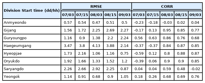 Table 2는 검증에 이용한 파고부이 8개 자료와의 통계 분석을 통한 RMSE와 상관도를 나타내었으며 태풍 내습 기간에 대해 산정하였다. 분석결과 08일 03시 자료부터 안면도를 제외한 지역의 상관도는 높은 것으로 나타나나 전체적인 RMSE는 높은 오차율을 보였다.